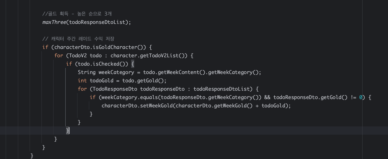 -> todoResponseDtoList 생성 후 character.getTodoV2List() 반복문 한번 더 돌림. 같은 카테고리 토탈 골드 확인후 weekGold에 더함