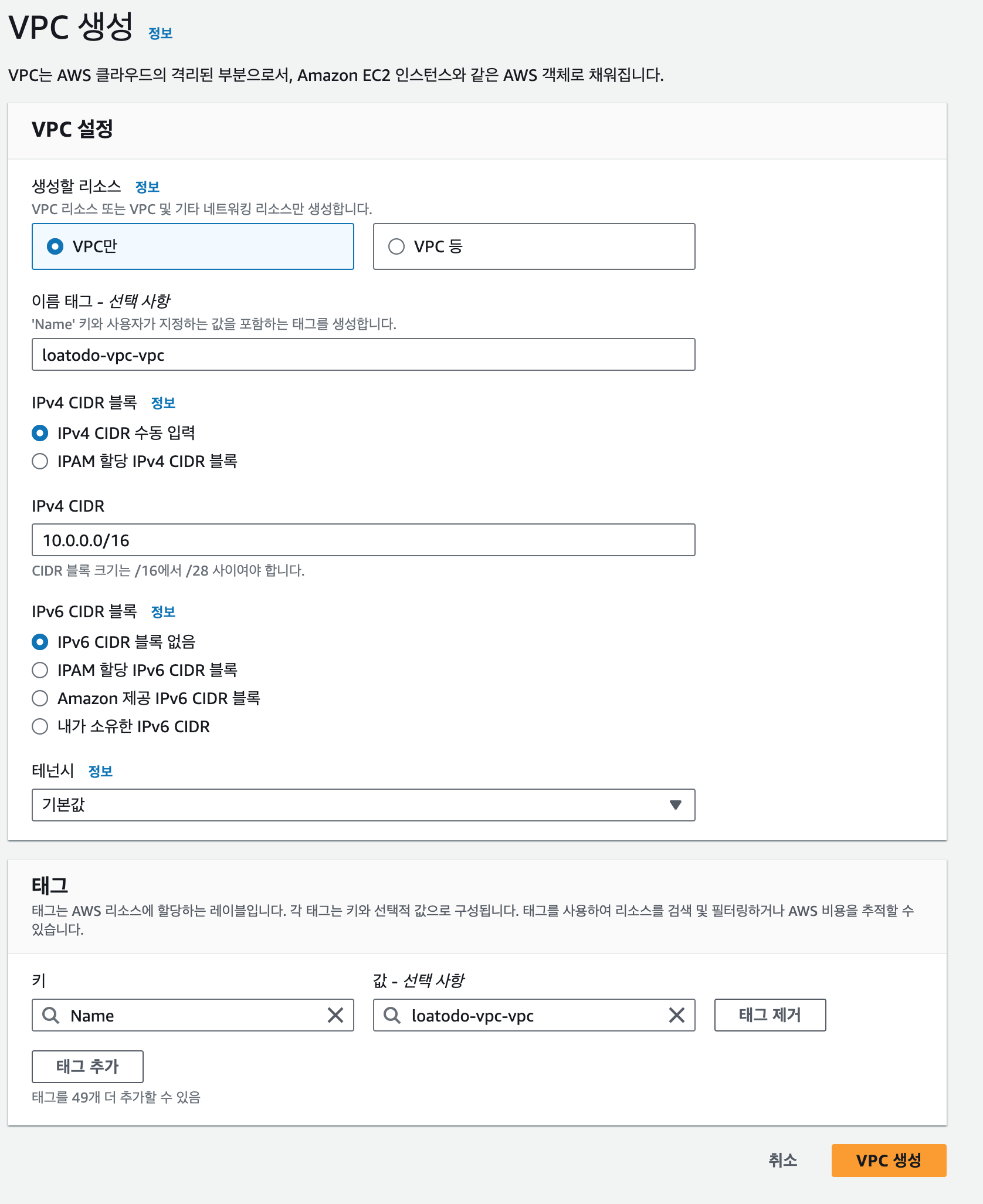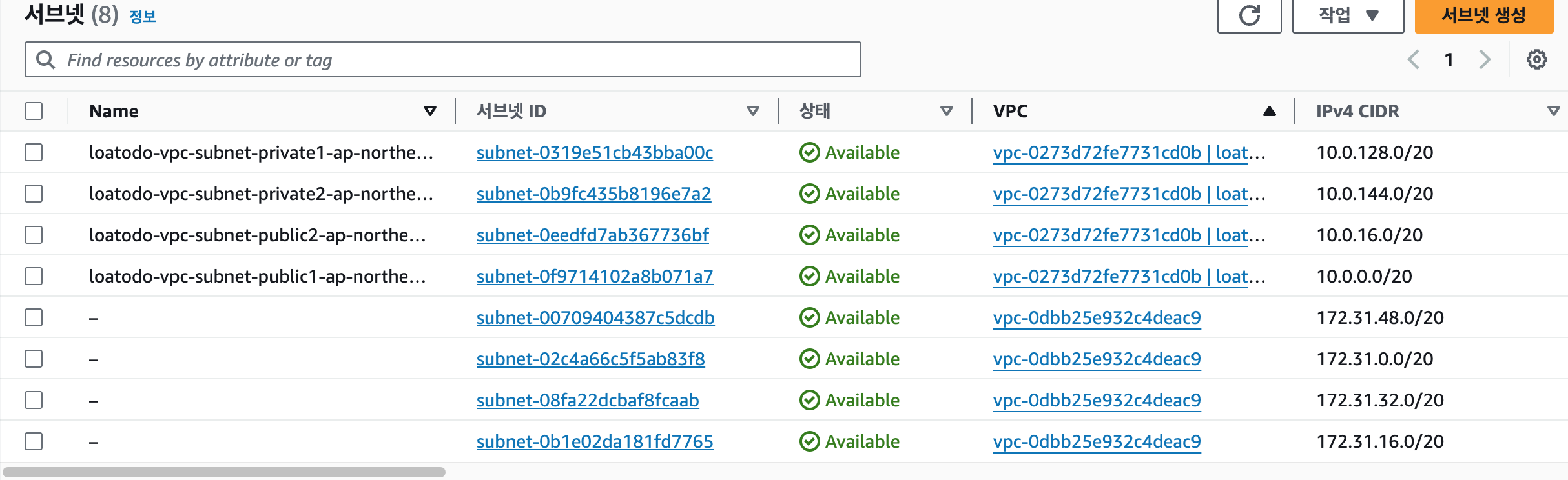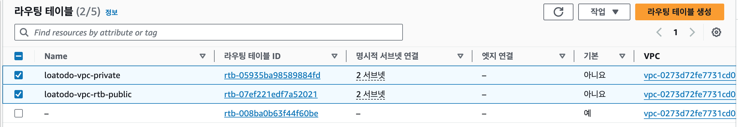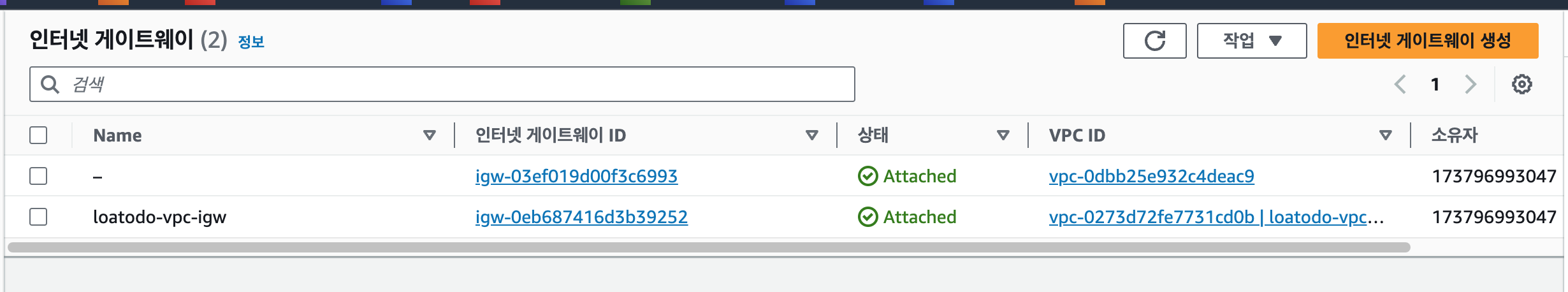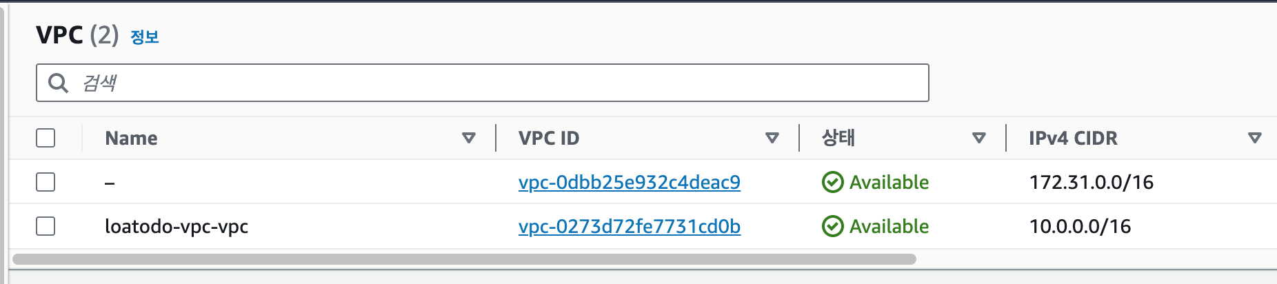 여기에 추가로 loatodo-vpc를 생성하였다.