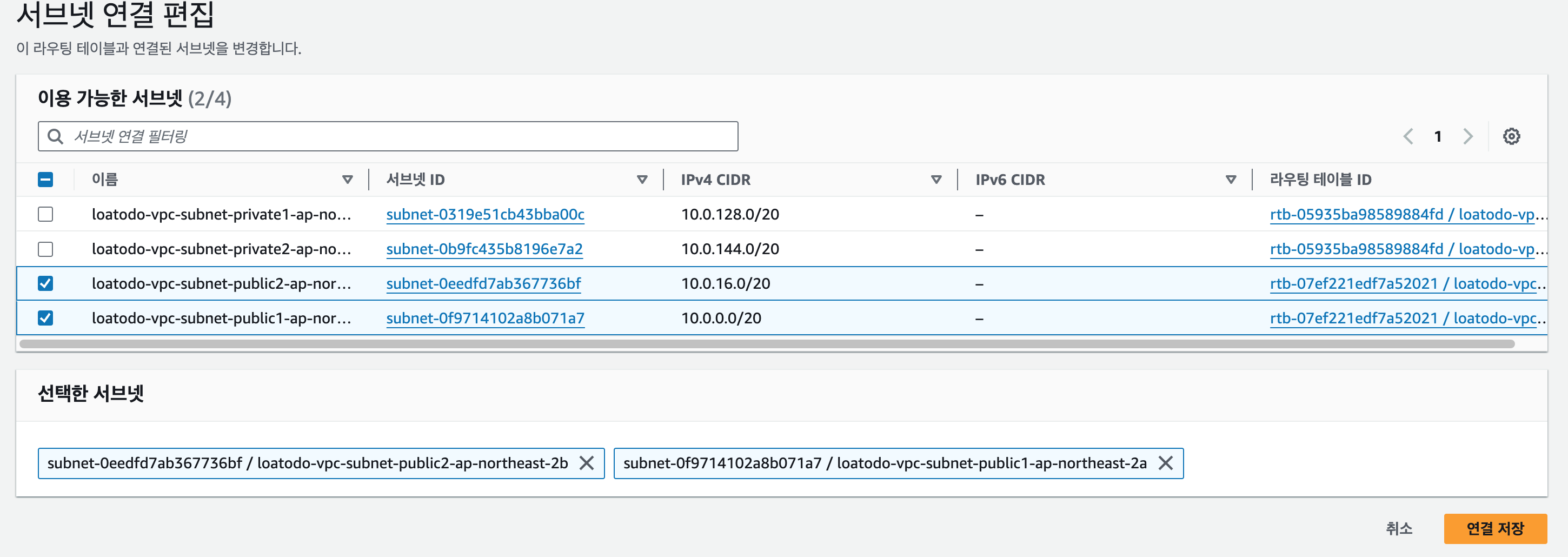 그후 각 라우팅 테이블에 서브넷을 연결한다.
