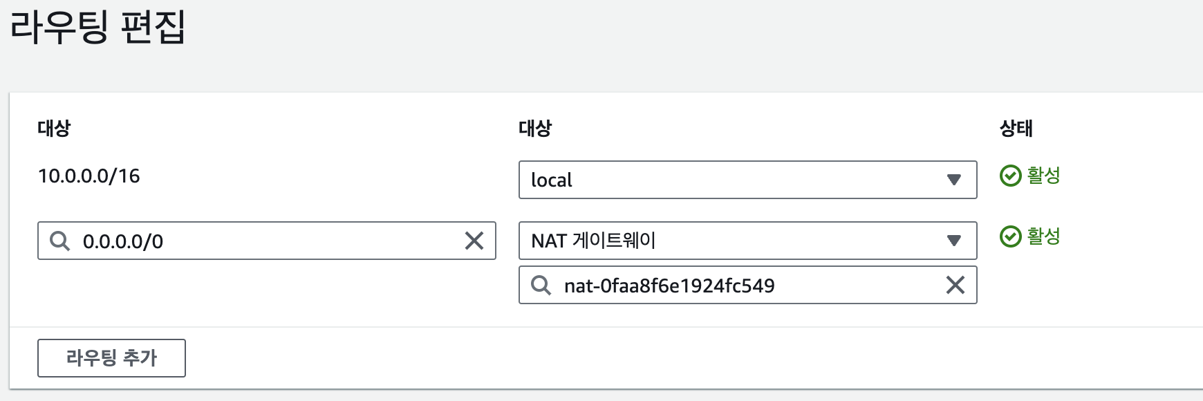 그 후 라우팅 테이블에 프라이빗 테이블 규칙에 NAT 게이트웨이를 추가한다.