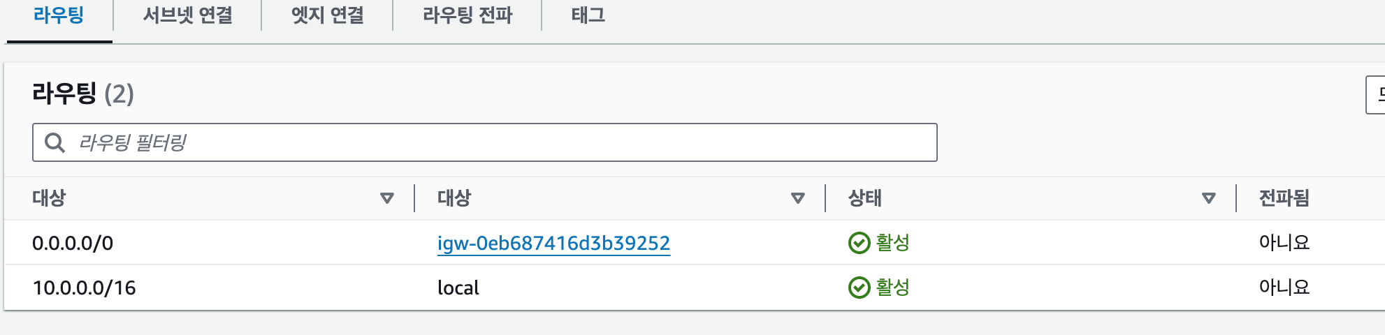 서브넷을 생성하고 라우팅 테이블을 따로 설정하지 않았으므로, 서브넷은 모두 기본 라우팅 테이블에 연결이 되어 있다.
