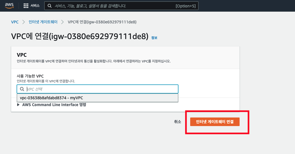 인터넷 게이트웨이 생성 직후 페이지에서 'VPC에 연결' 버튼을 클릭하면 VPC에 연결할 수 있다.