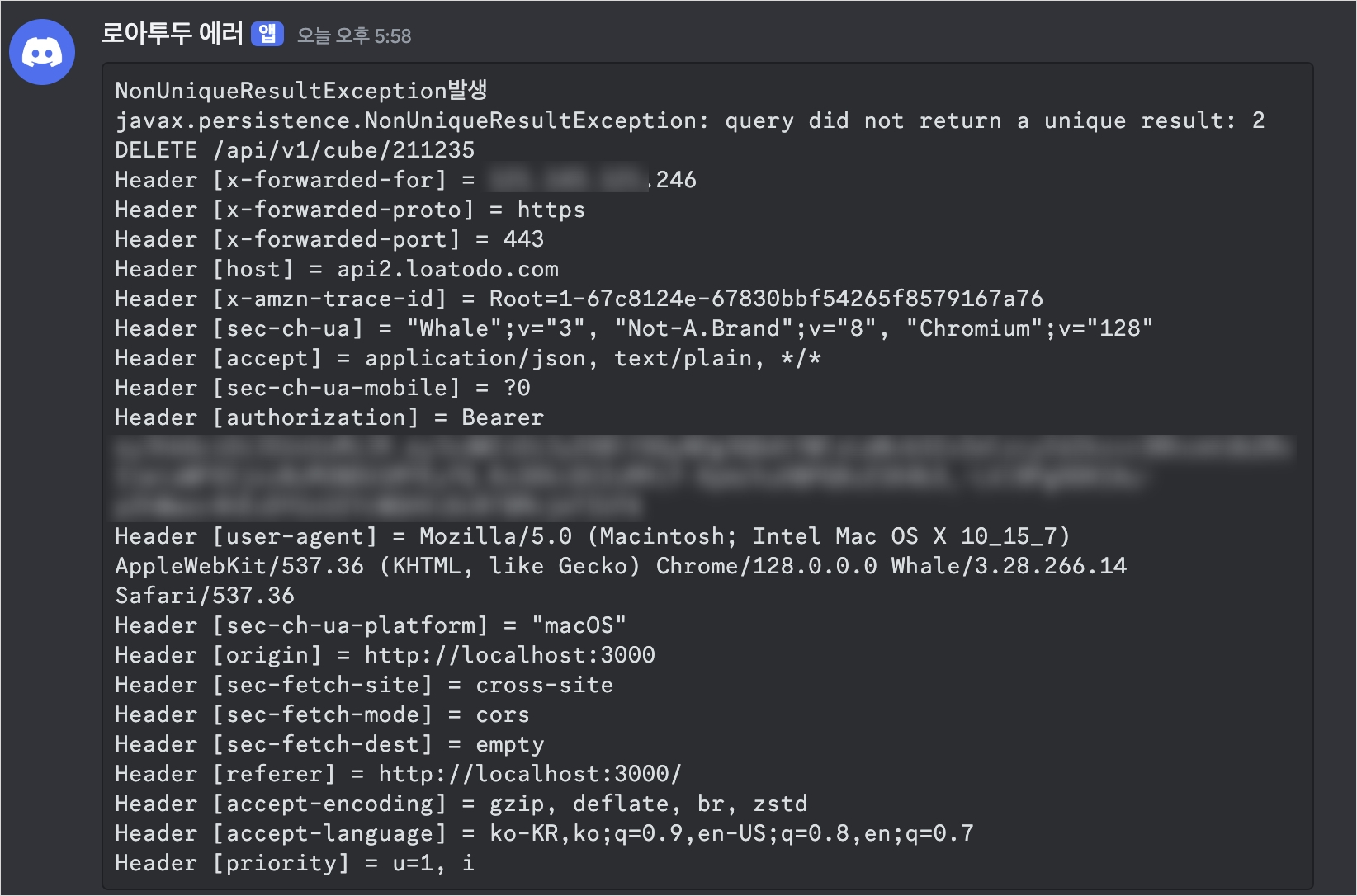 치명적인 에러인 경우 API 정보와 함께 로그를 출력하고, 헤더의 내용을 더해 웹훅으로 전송한다.