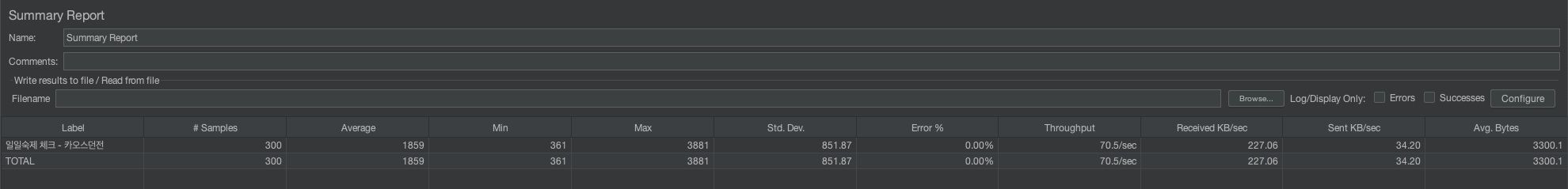 평균 응답 시간(1.86초)과 최대 응답 시간(3.88초)이 다소 느림. 응답 시간의 변동성(표준편차 851.87ms)도 큼.