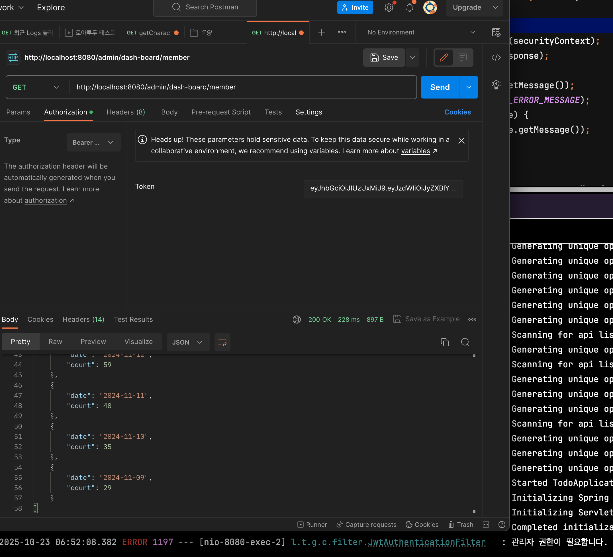 일반 사용자 토큰으로 `/admin/dash-board/member` 경로에 접근하면 필터에서 권한을 체크하고 막아야 하지만, 실제로는 서비스 레이어가 실행됐다. 로그만 남고 응답은 정상적으로 내려가는 것이다.