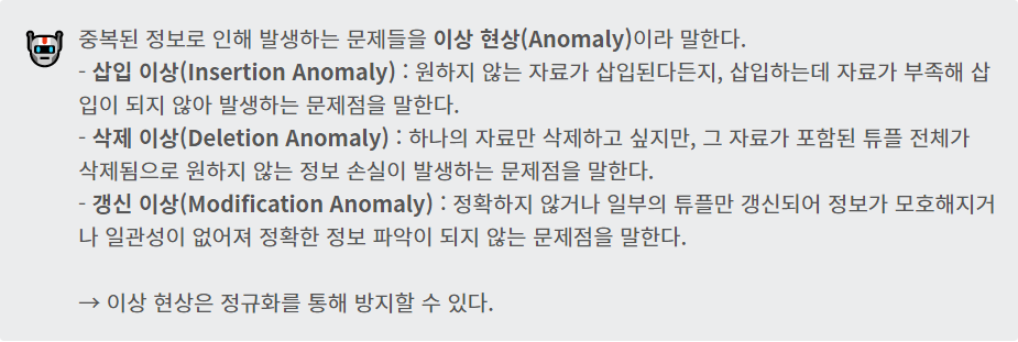 - 각종 이상 현상(Anomaly)을 방지하기 위해서, 테이블의 구성을 논리적이고 직관적으로 한다.