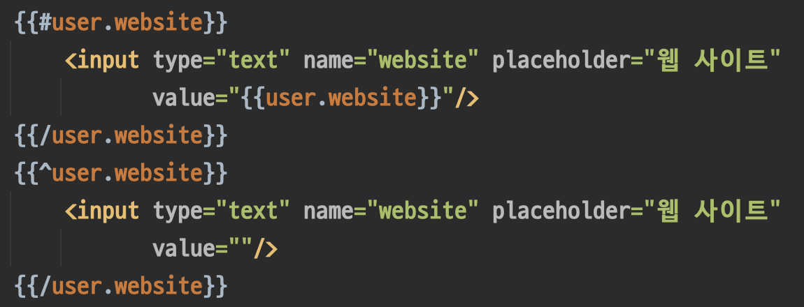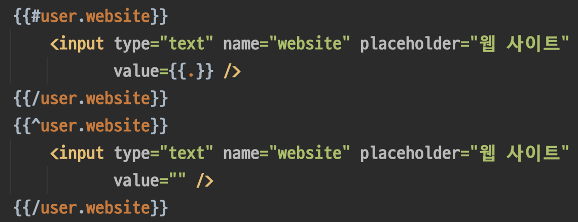 조건을 {{#user.website}}로 null인지 확인 후 그 안에 있는 데이터를 출력하는 문법이기 때문에