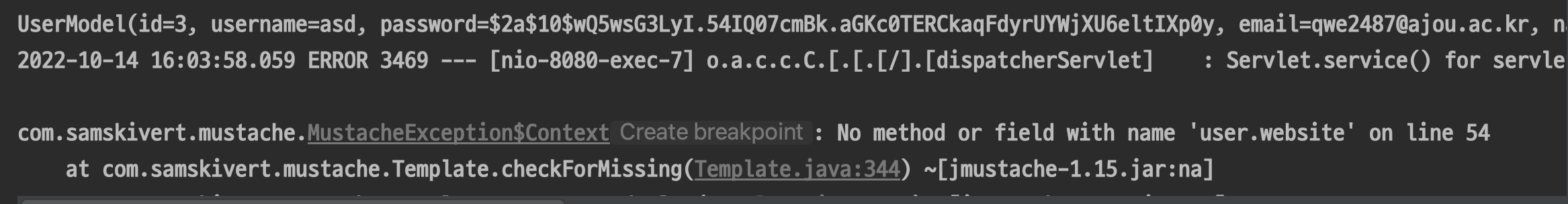 UserModel(id=3, username=asd, password=$2a$10$wQ5wsG3LyI.54IQ07cmBk.aGKc0TERCkaqFdyrUYWjXU6eltIXp0y, email=qwe2487@ajou.ac.kr, name=이민혁, website=asdasdwdawd, bio=test, phone=null, gender=null, profileImageUrl=null, role=ROLE_USER, regDate=2022-10-14T16:01:22.496045)