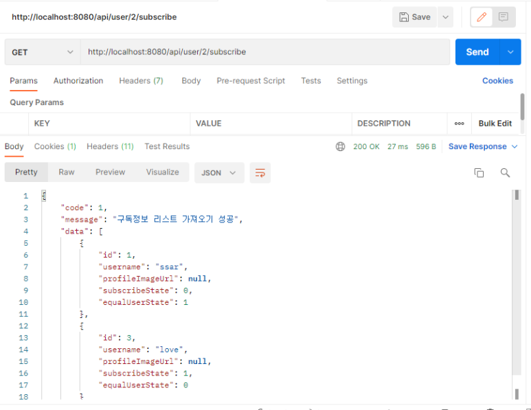 [ 예시 / 인스타그램 클론코딩 중 구독 정보 조회 커리 ]